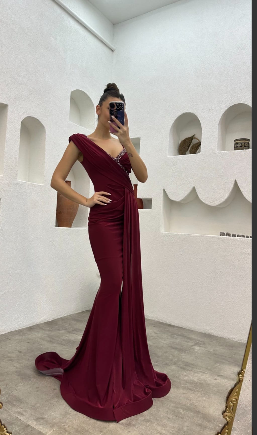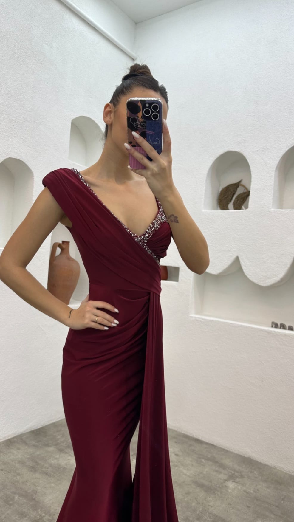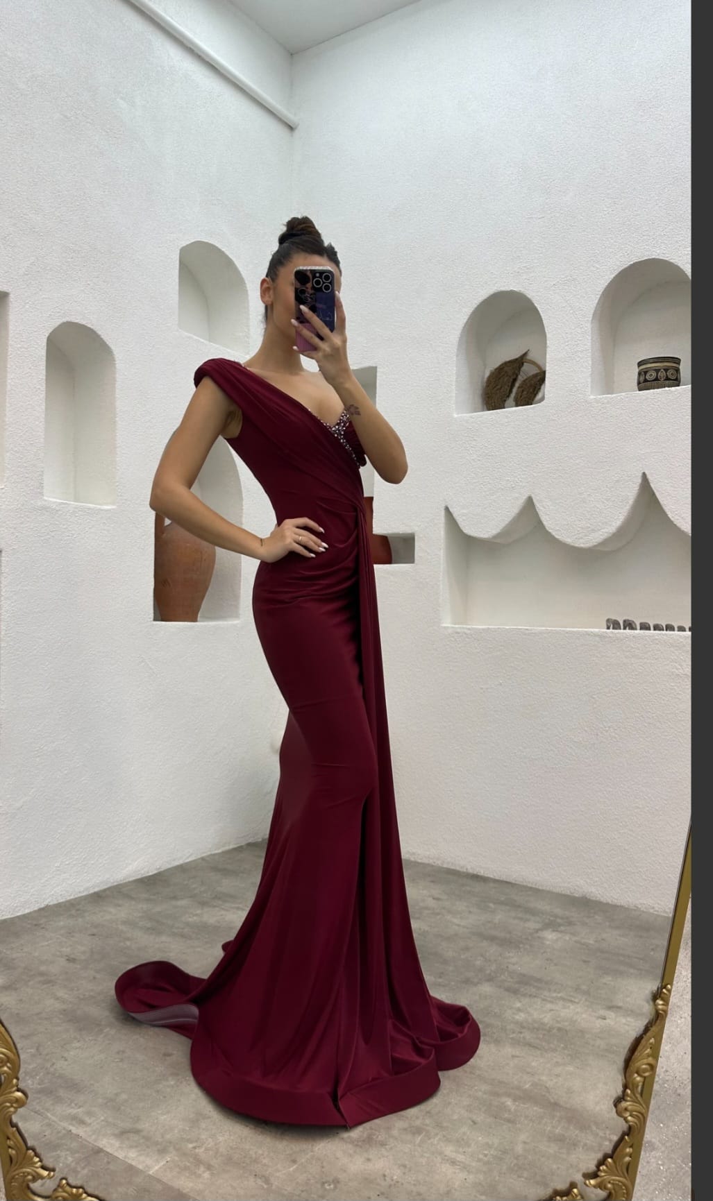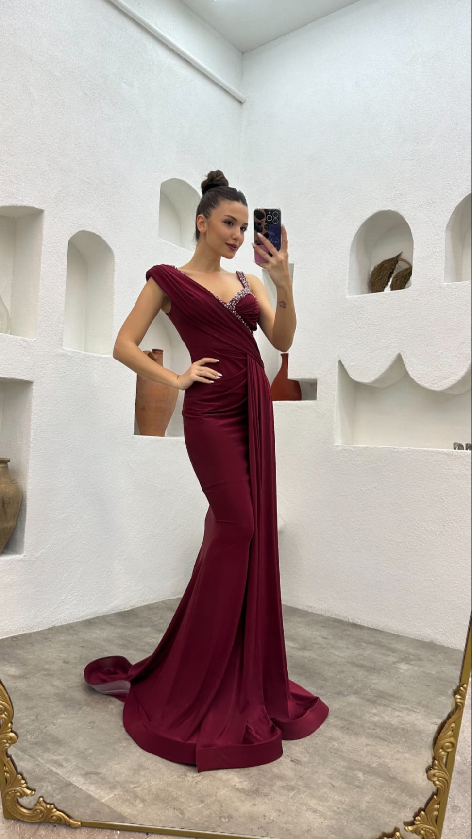 Bordo Tek Omuz İşlemeli Saten Abiye Elbise