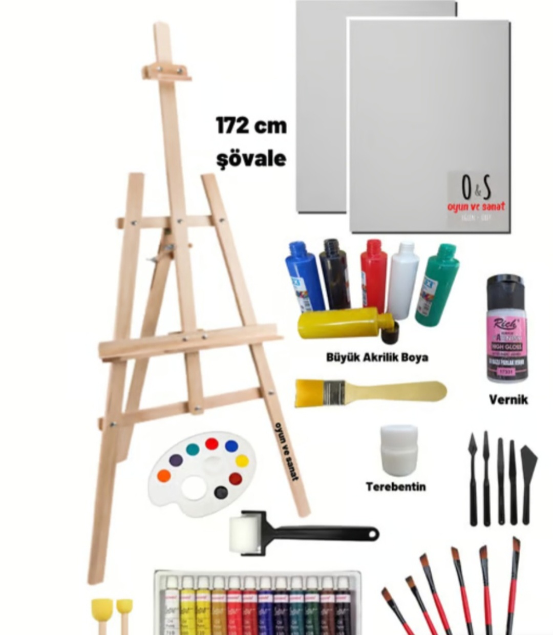 Set içeriğimiz: 172 cm ahşap şövale, 2 adet 50×35 cm tuval, 6lı fırça seti, palet, pon pon fırça, plastik spatula (beyaz gönderilecektir), resim verniği, terebentin, 6 renkli 60ar ml akrilik boya , 12 renkli 8er ml yağlı boya, zemin fırçası, rulo fırçası.